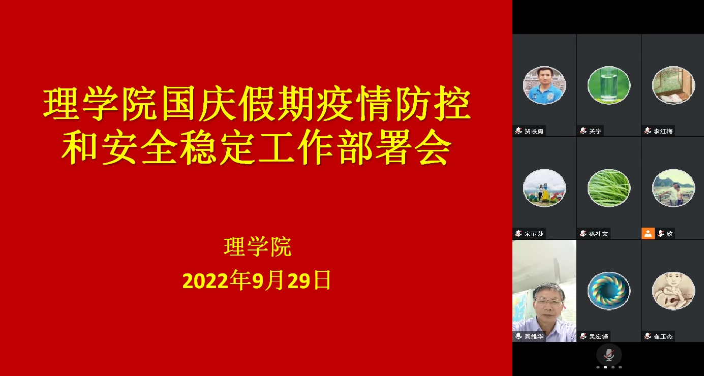 为落实公司关于国庆假期安全稳定工作的会议精神,9月29日晚,伟德国际1946线上召开国庆假期安全稳定和疫情防控工作部署会。公司党委委员、班子成员、系主任、责任教授、支部书记、班导师、辅导员、办公室全体老师参加会议。会议由公司党委书记龚维华主持。
