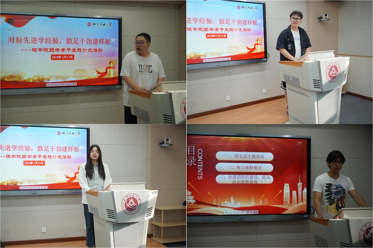员工兼职团委副书记刘东润从思想政治建设、团员管理和团干部管理三个方面分享了伟德国际1946团委在样板建设中如何进一步做深做实的建议;统22-2团支部书记原源分享了团支部活动开展的一些经验并就如何打造品牌性工作提出了自己的看法;信21-2班长吴鸿宇从专业学习、学科竞赛和志愿服务三个方面方面分享了自己的心得体会并就如何将自己打造成为一名工大样板青年提出了自己的见解;统23-1团支部书记张嘉灏就如何落实好团支部的制度建设以及班团一体化建设分享了自己的想法。
