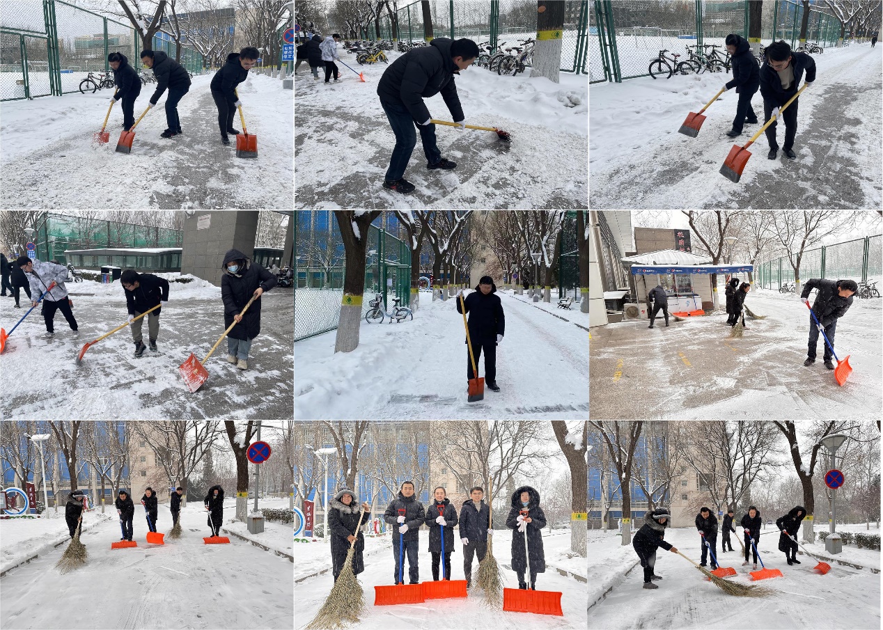 最美下雪天,最暖扫雪人。在公司党委书记龚维华的带领下,大家不畏严寒,有序地清理道路积雪、铲除路面结冰,博远楼西侧至广学楼天桥的主干道上留下了大家顶风冒雪、甘为奉献的身影。经过连续两天一上午的辛勤奋战,“除雪行动”成效显著,为全校师生开辟了一条洋溢着暖暖温情的安全之路。