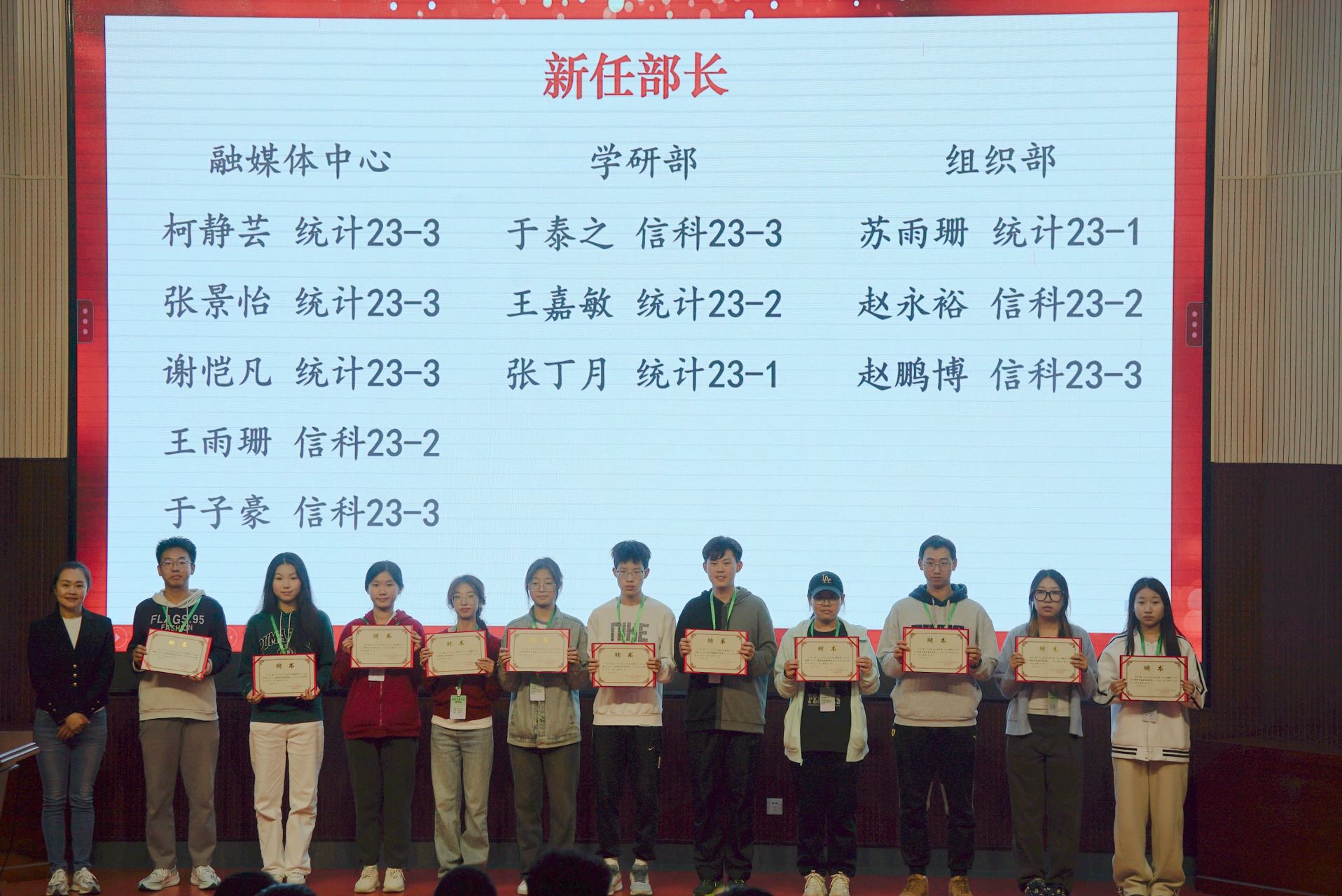 夏丹梅、熊敏为公司团学第二十届优秀部长和志愿者颁发了奖状,并为公司团学第二十一届主席团成员颁发聘书,贺映勇为公司团学第二十届主席团成员颁发了任职荣誉证书。